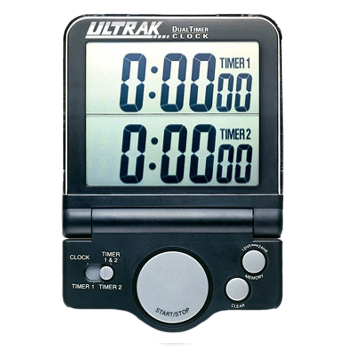 Minuteur géant ULTRAK à affichage double. Alarme sonore lorsque le temps est écoulé. Compte à rebours de 24 heures avec une résolution de 1 seconde. Mémoire double.