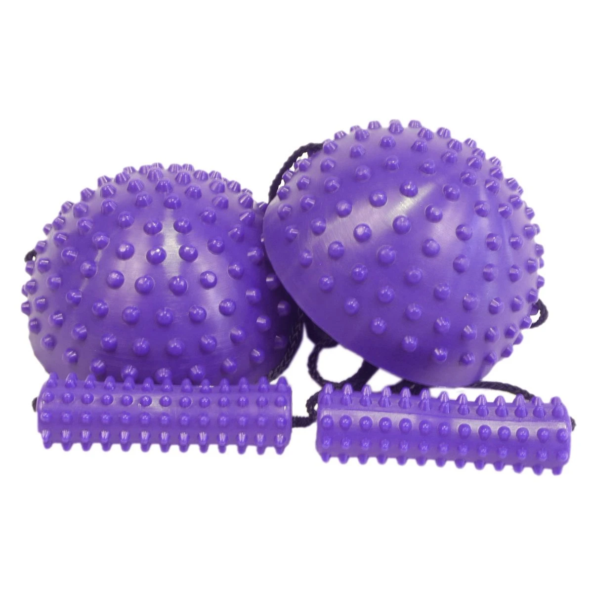 Paire d’hémisphères d’équilibre avec cordes et poignées. Faits de vinyle souple et durable, parfaits pour le développement moteur et sensoriel.