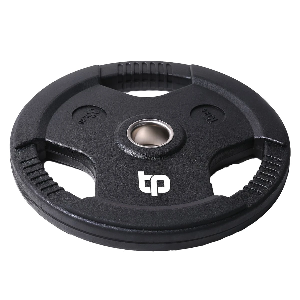 Plaque olympique en caoutchouc. Le design Ă 3 poignĂ©es permet d’effectuer une multitude d’exercices.