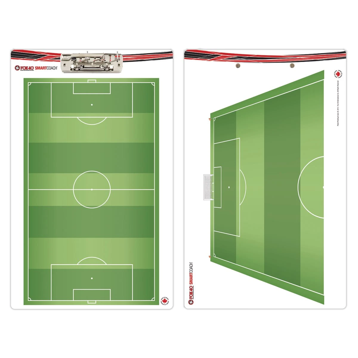 Tableau de jeu Smartcoach pro de soccer. Surfaces effaçables à sec en couleur. Surfaces de jeux à deux faces avec un terrain complet en 2 dimensions d’un côté et un demi-terrain en gros plan de l’autre côté. Le tableau comprend un marqueur effaçable à sec.
